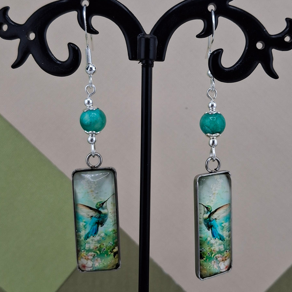 Aqua Quartzite Glass Rectangle Hummingbird Earrings