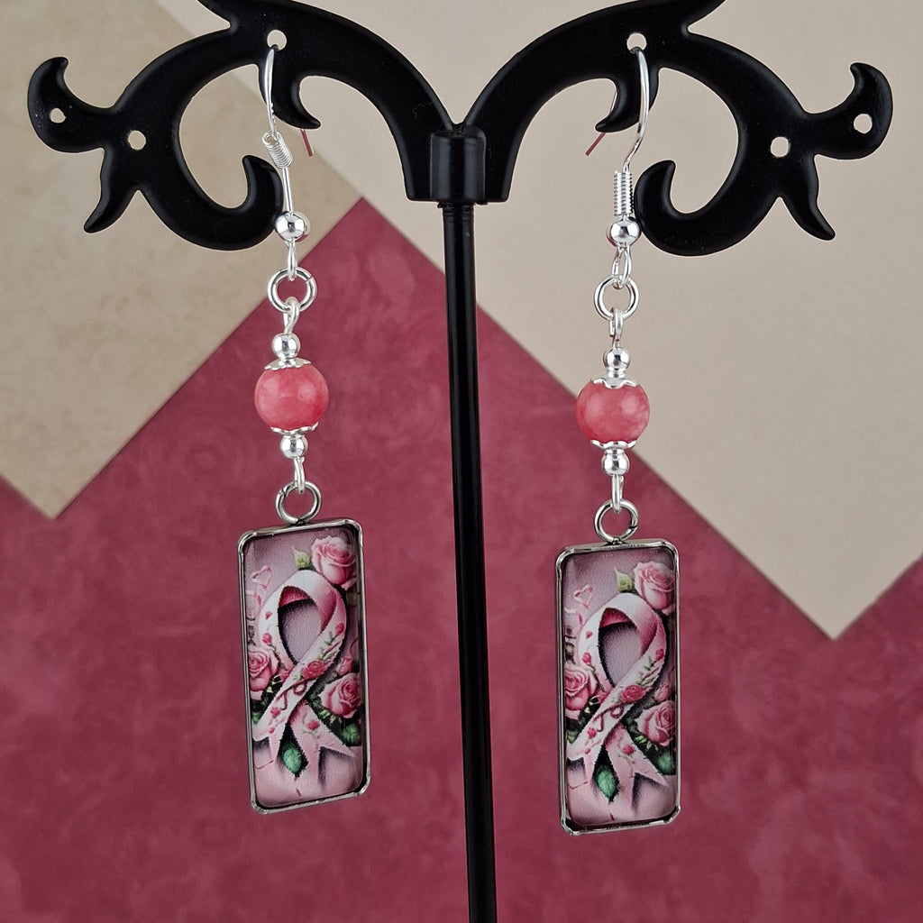 Strawberry Quartz Glass Rectangle Ribbon/Roses Earrings